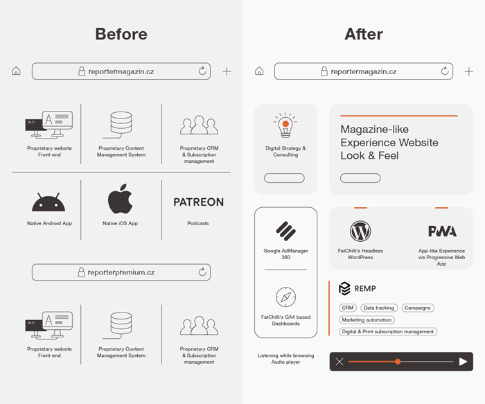 Digitální strategii obnášející nový přístup k získávání a retenci uživatelů stejně jako nové pojetí digitálních kanálů představil v loňském roce magazín Reportér. Na nové digitální strategii, která se připravovala téměř rok, spolupracoval se slovenskou FatChilli for Publishers. Agentura zaměřující se na monetizaci webových stránek vydavatelů nabídla pohled do příprav a realizace jednotlivých fází proměny digitální strategie Reportéra v případové studii, kterou je možné přečíst si na blogu agentury. Níže v textu shrnujeme některé základní poznatky.