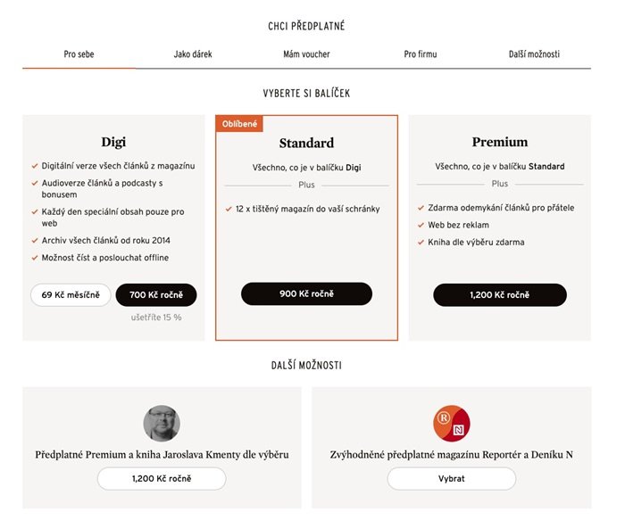 Novinkou je také zavedená kategorizace při nákupu předplatného podle toho, zda je předplatné určeno pro osobní potřebu, pro firmu nebo jako dárek. Díky tomu je pak možné přizpůsobovat další nabídky. Zavedená personalizace předplatného umožňuje postupně zvyšovat hodnotu objednávky od základního digitálního balíčku a poté přidávat další doplňky, jako je možnost odemykat články pro přátele, prohlížet web bez reklam nebo bezplatně si objednat knihu podle čtenářova výběru. Možné je volit ze tří základních balíčků předplatného (digi, standard a premium v rozmezí od 700 Kč do 1200 Kč měsíčně). Předplatitelé také mohou odložit začátek předplatného tištěné verze o zvolený čas a zároveň získat okamžitý přístup k digitálnímu obsahu.