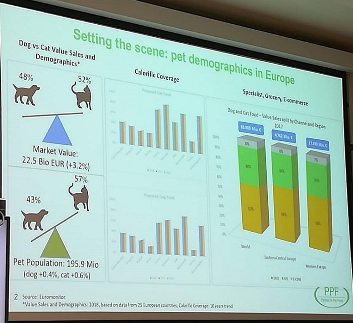 Albino Zamboni, Marketing a Pet Specialist Business Director firmy Partner in Pet Food Europe (PPF), představil na úvod trendy na pet trhu v Evropě a zaměřil se na hlavní skupiny, tedy na psy a kočky. Hodnota tohoto trhu je 22,5 miliard eur. Překvapivě v procentech obratu vedou kočky 52 % oproti psům 48 %. V Evropě lidé chovají přes 195 milionů psích nebo kočičích mazlíčků. Každoročně pak přibude jeden milion nových. Český trh s domácími mazlíčky je velmi rozvinutý a Zamboni přiznal, že pokud jeho firma něco testuje, používá nás jako laboratoř, kde novinky zkouší.