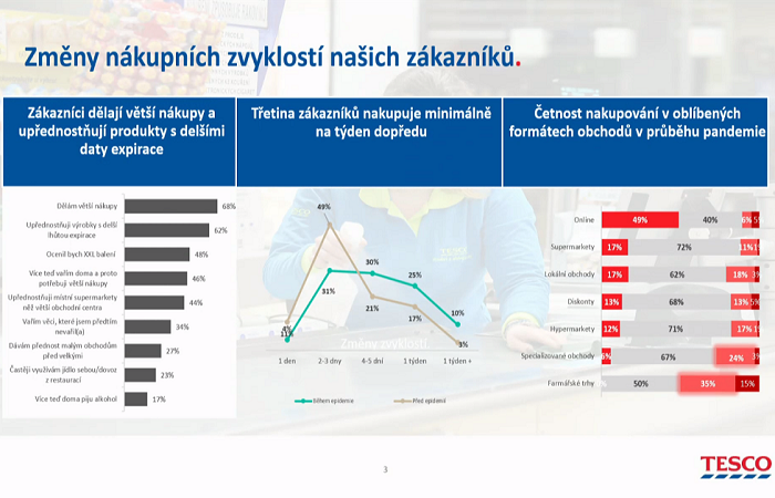 Patrik Dojčinovič, výkonný ředitel Tesco ČR, popsal, jak se změnila struktura poptávky v rámci Tesco omnichannel. Během covidu registroval řetězec změnu nákupního chování zákazníků, kteří začali nakupovat méně často a větší nákupní košíky. Zatímco před covidem se zvyšoval počet menších nákupů, na jeden až 3 dny, postupně začali lidé nakupovat na čtyři a více dní, to předtím nebylo,“ uvedl Patrik Dojčinovič. Zvýšil se také prodej online, a to o 72 % a zákazníci u této služby zůstávají.