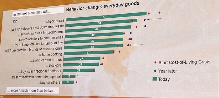 Vysoký podíl promocí i privátních značek na trhu potvrdila svými daty i Lenneke Schils z výzkumné agentury GfK. Podíl nákupů ve slevě dosahuje nyní na tuzemském trhu 53 %, podíl privátních značek řetězců 30 %. To ale nejsou jediné změny, které se za poslední roky, poznamenané nebývalou inflací, odehrály.