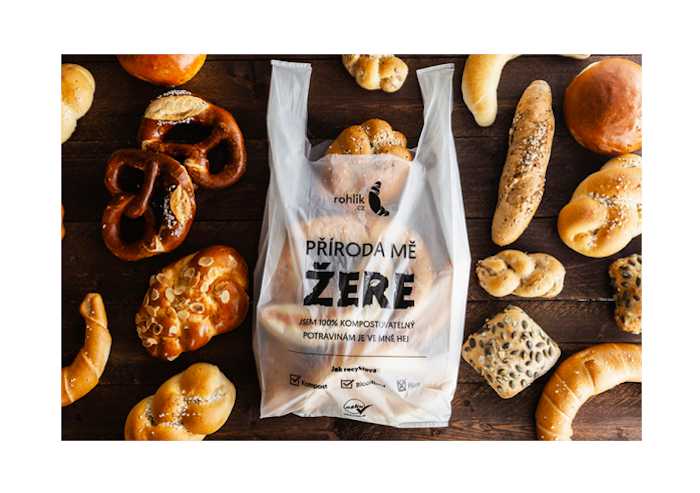 Online supermarket Rohlík nově začíná balit pečivo do 100% kompostovatelných sáčků. Jsou vyrobeny z kukuřičného škrobu a v kompostu nebo bioodpadu se mají rozložit za 28 dní.