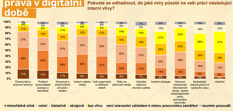 Výzkum vedle otázek spojených s žurnalistikou v digitální době navázal na dřívější výzkumy zkoumající české novináře z let 2004 a 2015. Přináší tak znovu pohled na sociodemografii a názorové postoje českých novinářů i podmínky jejich práce. Například 55 % novinářů označuje časový tlak a pracovní termíny za nejsilnější interní vlivy působící na práci novinářů. Druhým nejsilnějším vlivem jsou profesní zpravodajské postupy a standardy. Naopak na konci této škály se objevují vlastnické vlivy, které za mimořádně silné nebo velmi silné označuje více než desetina (11 %) respondentů.