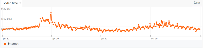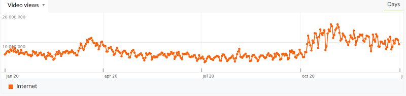 Jak vyplývá z následujících grafů, počet video přehrání na českém internetu byl nejvyšší loni na podzim, přibližně od října do prosince. Naopak čas strávený sledováním videa byl nejvyšší v jarních měsících.