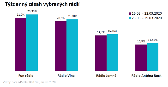 Fun rádio, Rádio Vlna, Rádo Jemné nebo Anténa Rock svůj týdenní zásah v posledním březnovém týdnu ve srovnání s týdnem od 16. března navýšily. Vyšší zásahy ukazují data také pro víkendové vysílání rozhlasových stanic, kde se nejvíce vyskočila Rádiu Expres a Rádio Slovensko.