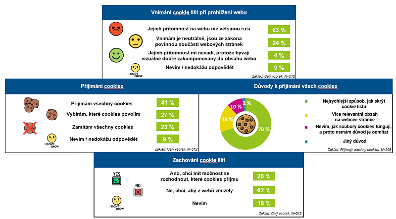 Většině internetových uživatelů přítomnost tzv. cookie lišt na internetových stránkách vadí. Necelé dvě třetiny (63 %) všech respondentů uvedly, že přítomnost cookie lišt na webu je většinou ruší. Čtvrtina (24 %) je vnímá neutrálně. Cookie lišty nevadí jen 4 % uživatelů. Necelá desetina nedokáže odpovědět.