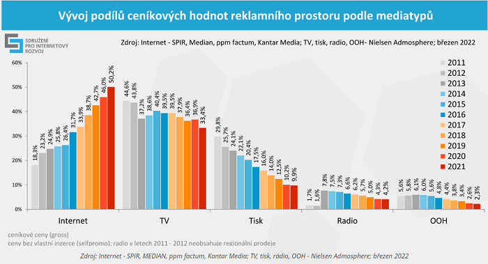Vzhledem k tomu, že výkon všech ostatních mediatypů na trhu je udáván v ceníkových cenách, ale objem internetové inzerce je tvořen ceníkovými i čistými cenami, rozhodl se SPIR výzkum pro rok 2021 metodicky upravit, aby bylo možné porovnávání s ostatními mediatypy. Úprava metodiky spočívá v přepočítání celkového výkonu onlinu na ceníkové ceny. Výkon online reklamy tvořený součtem ceníkových a čistých cen v loňském roce dosáhl 48,3 mld. Kč. V ceníkových cenách se jedná o objem 96,6 mld. Kč, což podle SPIR znamená, že internet byl loni inzertně nejsilnější mediatyp.
