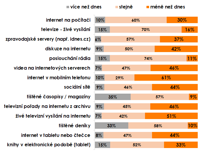 Mediální chování lidí ve věku 55-69 let je stále významně ovlivněno tradičními médii. V porovnání se skupinou 15-54 let více sledují televizi, tištěná média, rádio i zpravodajské weby. Jsou ale patrné změny v porovnání s obdobím před šesti lety. I ve skupině 55-69 klesla konzumace tištěných deníků a časopisů cca o čtvrtinu v průměrné týdenní frekvenci, naopak výrazný nárůst je u návštěvnosti internetových zpravodajských serverů, využití internetu na PC, sledování videí na internetu a návštěvy sociálních sítí. Největší nárůst je ale ve využití internetu v mobilu – téměř trojnásobný ve frekvenci užití alespoň jednou týdně. Z televizního sledování má stále prim lineární televize (sledují dvě třetiny z nich). Většinou si vystačí se základní nabídkou a nemají potřebu dokupovat VOD služby.