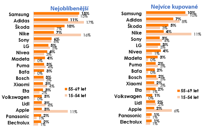 Nejoblíbenější a zároveň i nejčastěji kupovanou značkou bez ohledu na kategorii je u generace 55-69 let značka Samsung, následují Adidas a Škoda. U mladší skupiny vedou značky Nike, Adidas a Apple. Není výrazná dominance nějaké oblíbené značky na úkor kupované, což svědčí o realistickém pohledu starší generace, racionálnějším nakupování a o odlišném finančním chování (např. větší míra spoření). Téměř polovina této generace má své peníze uložené na spořícím účtu (46 %). Investice často vydávají směrem ke svým dětem a vnoučatům a pokud jde o finanční zhodnocení, mají nejvyšší zastoupení investice do investičních a podílových fondů a do nemovitostí (shodně 18 %). Pro tuto generaci také platí, že se méně zadlužuje než generace mladší.