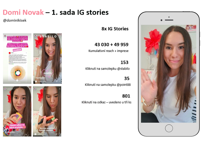 Léto a podzim jsou hlavní období prodejů značky Stabilo, prodejce psacích a kreslících potřeb. Dosud firma komunikovala především přes televizi, ovšem v letošním roce se rozhodla vyzkoušet jako hlavní médium Instagram a Youtube a výsledky ji překvapily. Celkově dosáhli za celou kampaň v ČR téměř 8 milionů impresí a zvedl se prodej konkrétního produktu o 30 %.