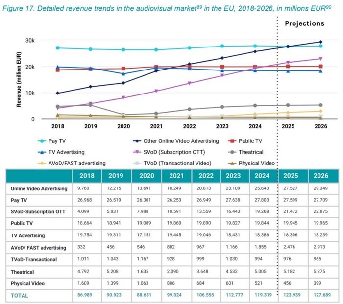 Podíl vysílatelů na tržbách klesl z 75 % v roce 2018 na očekávaných 53 % v roce 2025, zatímco SVoD (příjmy z předplatného videa) má do stejného roku vzrůst na 17 %. Příjmy kin po pandemii oživily, ale stále nedosáhly předcovidových hodnot.