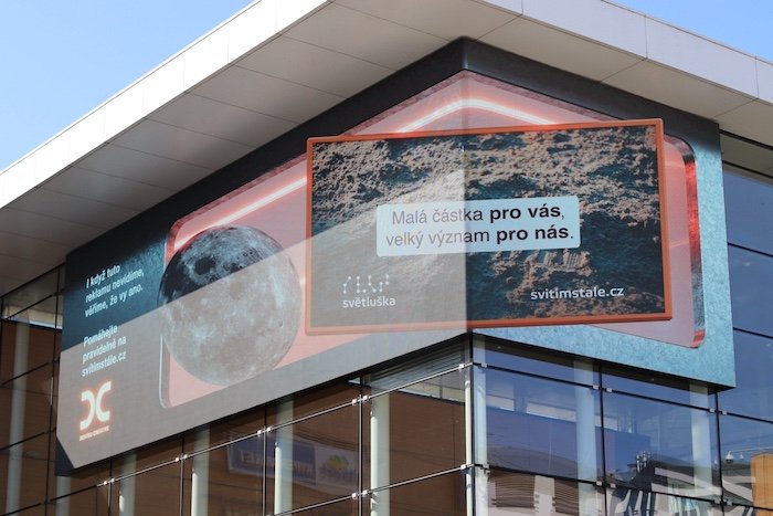 Projekt Nadačního fondu Českého rozhlasu Světluška v komunikaci využila 3D venkovní reklamu. Po komerčních subjektech – Budějovickém Budvaru, Komerční bance a Mastercard – se tak jedná o první charitativní počin na poli 3D OOH. Na fasádě Galerie Harfa a u O2 Universum nasadila Světluška anamorfní spot, který vznikl ve spolupráci s agenturou Dentsu Creative.