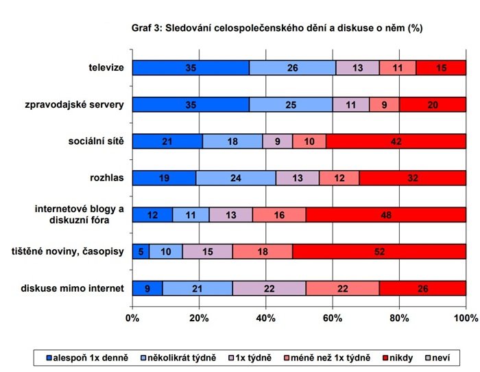 Ke každodennímu sledování celospolečenského dění žádný ze zkoumaných zdrojů nevyužívá 36 % dotázaných. Desetina (10 %) lidí žádným ze zkoumaných způsobů nesledují celospolečenské dění častěji než jednou týdně. Frekvence sledování je celkově významně provázaná s obecným zájmem o politiku. . S věkem roste především význam televize, ale v menší míře i tisku a rozhlasu, u sociálních sítí, internetových blogů a diskuzních fór i internetových zpravodajských serverů je korelace s věkem opačná.