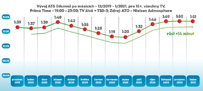 V roce 2020 strávili diváci sledováním televize rekordní dobu za 24let existence peoplemetrového měření. V divácké skupině 15+ věnovali diváci televizi téměř 4 hodiny denně (3 hodiny 59 minut). Od ledna do prosince narostl průměrný čas strávený u televize o 43 min (na 4 hodiny 47 minut), což odpovídá průměrné délce hlavní zpravodajské relace. Trend vyšší sledovanosti potvrdil i letošní leden, kdy průměrný čas u televize byl 4 hodiny 45 minut. Odložená sledovanost za posledních dvanáct měsíců dvojnásobně rostla. Uvedla to televizní asociace ATO, která je zadavatelem měření TV sledovanosti na českém trhu.