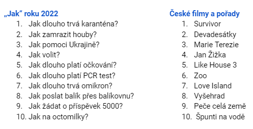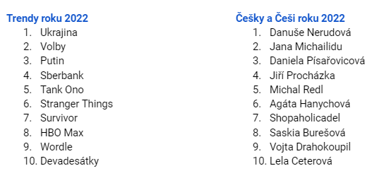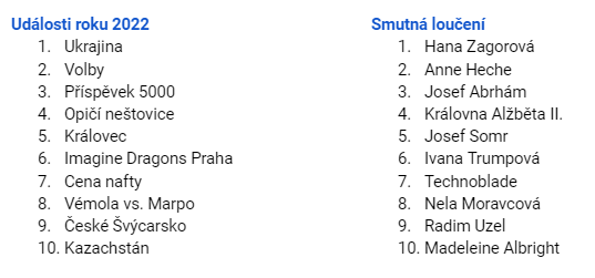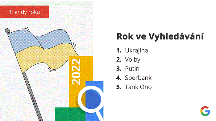 Google letos opět zveřejnil žebříček fenoménů, událostí a osobností, o které se Češi zajímali v uplynulém roce nejvíce. Na předních příčkách seznamu výrazů, jejichž objem vyhledávání letos nejvíce vzrostl oproti předchozímu roku, se objevují témata spojená s válkou na Ukrajině, komunální a senátní volby, síť čerpacích stanic nabízející nejlevnější ceny benzínu Tank Ono nebo insolvence banky Sberbank. Do žebříčku TOP 10 se letos probojovala i česká reality show Survivor a seriál Devadesátky.