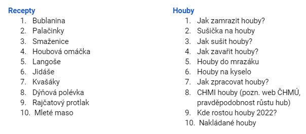 Pokud jde o vaření, zájem byl hlavně o sladké recepty. Konkrétně si pak Češi chtěli nejčastěji připravit bublaninu a palačinky. Zájem českých domácností směřoval také k houbám. Lidé vyhledávali informace o tom, kde právě rostou, ale také, jak je zamrazit, zpracovat, usušit, naložit nebo zavařit.