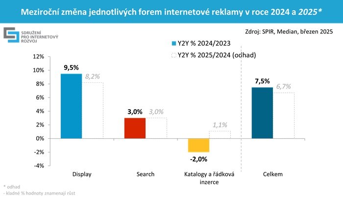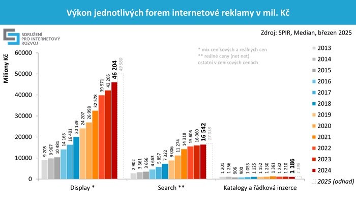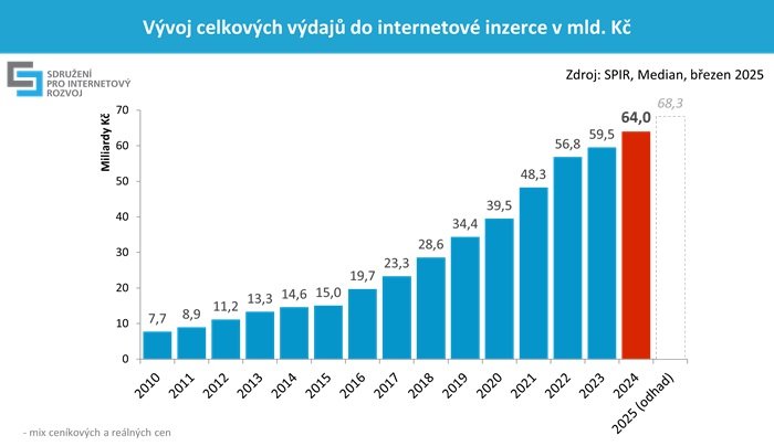 Zadavatelé v roce 2024 investovali do internetové reklamy rekordních 64 miliard korun v kombinaci ceníkových a čistých cen. Jde o historicky nejvyšší částku, která znamená meziroční nárůst o 7,5 %. Nejvíce k tomuto výsledku přispěla display reklama (+9,5 %) a programatický nákup display reklamy (+11 %), mírný růst zaznamenala i reklama ve vyhledávání (+3 %). Data zveřejnilo profesní sdružení SPIR.
