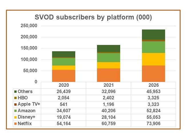 Počet předplatitelů videa na vyžádání (SVOD) v západní Evropě se má do roku 2026 zvýšit na 234 milionů a ve srovnání s koncem letošního roku vzrůst o 70 %. Hlavním hráčem SVOD trhu má být nadále Netflix, rychle ale poroste Disney+. Vyplývá to z nové studie Digital TV Research.