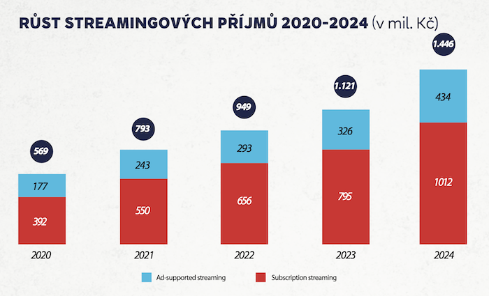 Příjmy hudebního průmyslu loni meziročně vzrostly o 20 % na celkových 2,241 mld. korun. Hlavním zdrojem je přitom v současnosti streaming, který má 64,5% podíl. Celkem si připsal 1,446 mld. korun, tedy o 29 % více než v roce 2023. Podle kvalifikovaného odhadu České národní skupiny Mezinárodní federace hudebního průmyslu (ČNS IFPI) představuje počet platících uživatelů streamingových služeb 2,3 milionů lidí.