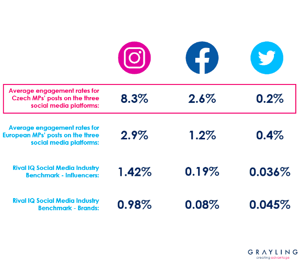 Z pohledu míry engagementu však Twitter poněkud pokulhává. Nejvyšší míru engagementu zaznamenává u politiků Instagram (8,3 %), poté Facebook (2,6 %). Ve srovnání se svými kolegy v Evropě však čeští politici dosahují mnohem vyšších hodnot a „úspěšněji“ vycházejí také z porovnání s influencery a značkami. Podle Bena Pettera to může být dáno jednak menší komunitou, která politiky sleduje, jednak tím, že reakce od fanoušků a sledujících nejsou zdaleka jen pozitivní. Politicky motivované příspěvky vyvolávají u lidí obecně mnohem více emocí, a tím pádem i reakcí.