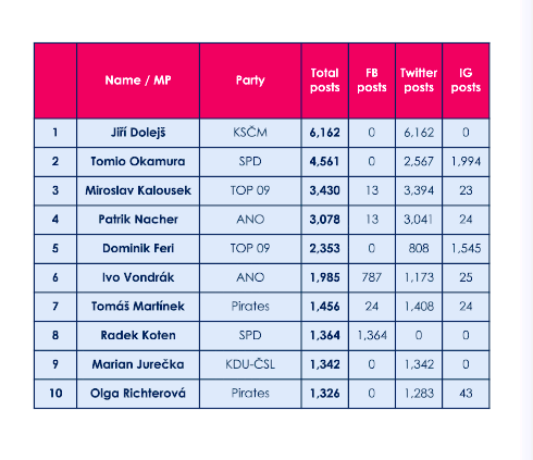 Co do počtu příspěvků je na sociálních sítích nejaktivnější Jiří Dolejš z KSČM, který jich jen na Twitter uveřejnil do konce roku 2020 6142. Na druhém místě je Tomio Okamura (SPD), na třetím Miroslav Kalousek (TOP 09), dále Patrik Nacher (ANO) a Dominik Feri (TOP 09)