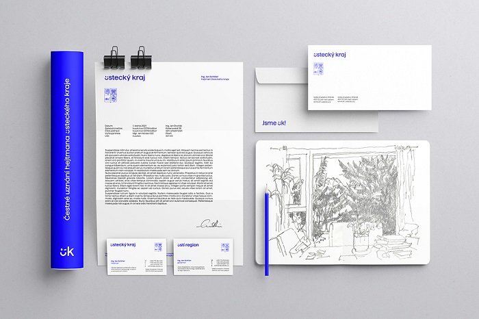 Designéři tak zaměnili písmeno Ú ve slově Ústecký za symbol úsměvu s mrkajícím okem jako čárkou. Barevnost vychází z barevnosti znaku kraje, ale nově jsou barvy zvýrazněny do maximálně sytých tónů. Primární je modrá, doplňková pak zelená a červená. Hlavním písmem byl zvolen grotesk Haffer SQ od studia Displaay.