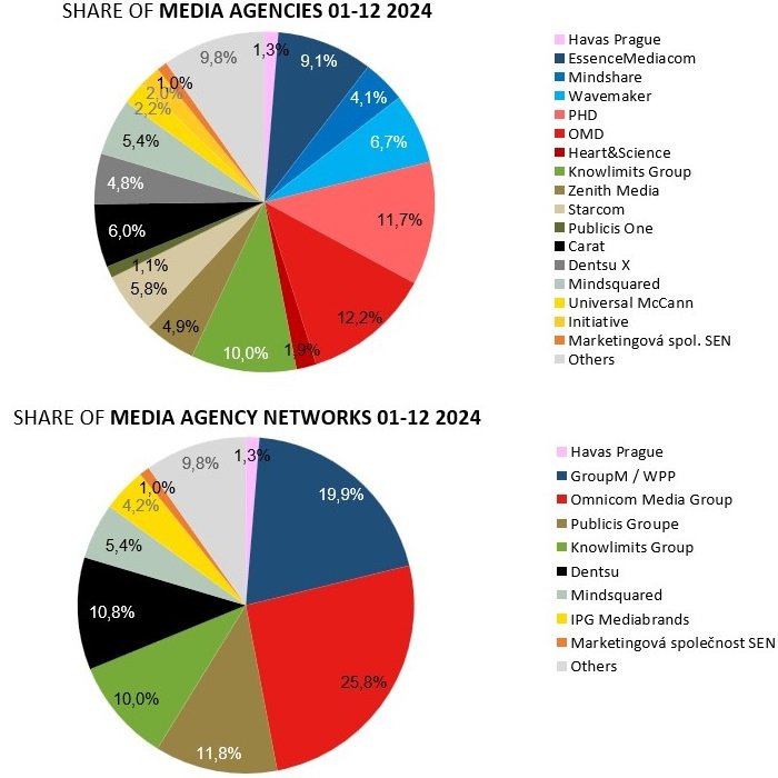 V podílu investic do televizní reklamy počítaném podle sítí mediálních agentur měla v loňském roce největší podíl Omnicom Media Group (25,8 %) před GroupM (19,9 %) a Publicis Groupe (11,8 %).