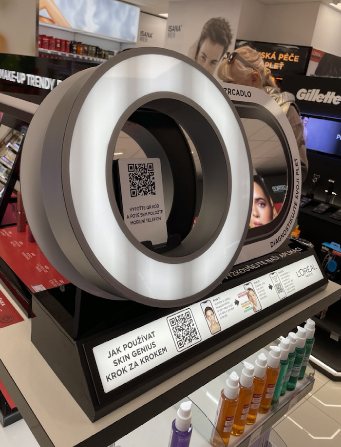 Virtuální zrcadlo značky L’Oréal Paris, které kromě Absolutního vítěze získalo ještě zlato v kategorii Drogerie, kosmetika, podporovalo v místě prodeje aplikaci Skin Genius, jež za pomoci umělé inteligence dokáže diagnostikovat pleť a na základě toho doporučit i vhodné produkty. Spodní část podstavce obsahuje edukační část o aplikaci včetně QR kódu pro její načtení. Zájemci o analýzu pleti následně umístí svůj mobilní telefon do držáku, kterému tvoří zázemí velké kruhové světlo. Po spuštění aplikace je možné aktivně pracovat s nastavením světla, které díky možnosti volby mezi teplým a studeným svícením a nastavením intenzity zachycuje potřebné detaily pleti. Vystavení také obsahuje produkty, které si zákazníci mohou zakoupit na základě výsledného doporučení.