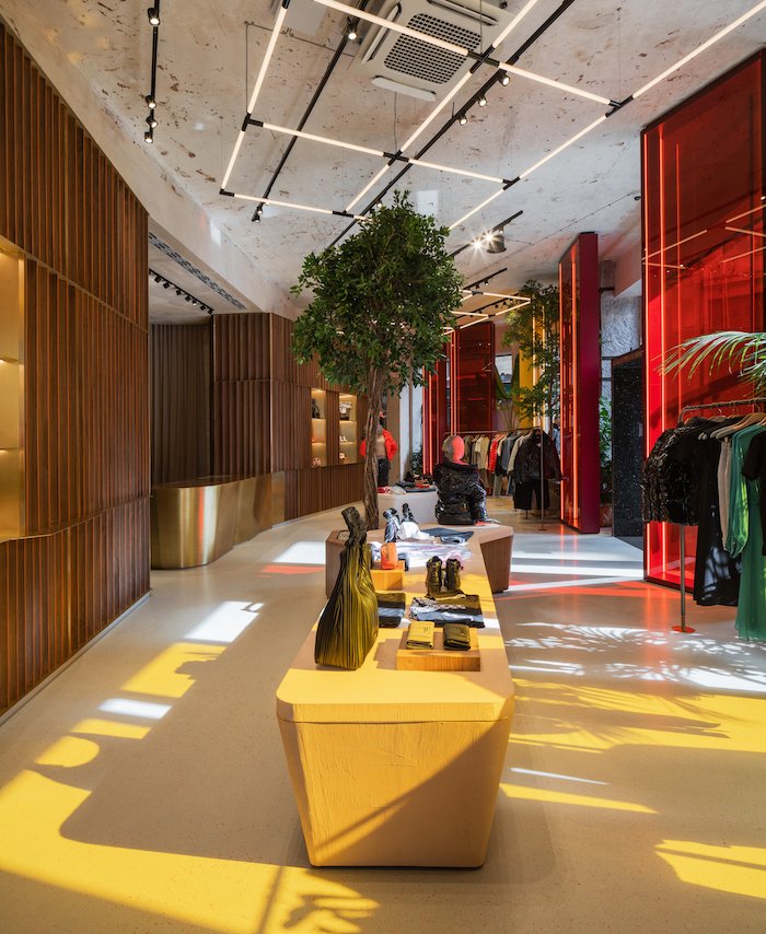 „S pomocí virtuální reality jsme nastavili rozložení nábytku, optimální hladinu světla a změnili umístění některých stojanů či rozmístění i množství rostlin. Také jsme si mohli prohlédnout, jak budou vypadat použité materiály, mezi něž již tradičně patří mosaz a dřevo. Zkrátka jsme se ujistili o některých dílčích řešeních, že budou fungovat v rámci celku. Díky převedení prodejny do virtuální reality jsme si mohli být jistí, že jsme prodejnu vyladili do posledního detailu. Jak se nám ostatně osvědčilo již při budování předchozích multibrandů,“ popisuje tvorbu prostoru Marco Donati, architekt ze studia Storage Milano.