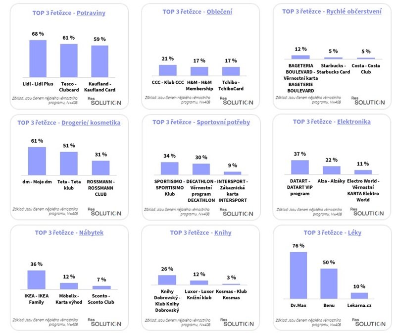 Nejrozšířenějším věrnostním programem u prodejců potravin je Lidl Plus (68 %). Druhým nejčetnějším je loňský vítěz Tesco-Clubcard (61 %), třetím Kaufland Card a těsně čtvrtá Penny karta (58 %). Přes polovinu respondentů (54 %) využívá věrnostní program Můj Albert.