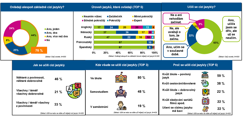 Mezi respondenty, kteří ovládají alespoň jeden cizí jazyk, je nejběžnější znalost angličtiny (83 %), němčiny (63 %) a ruštiny (53 %). TOP 5 jazyků doplňuje francouzština a španělština. Ostatní dotazované cizí jazyky znají pouze jednotky procent respondentů.