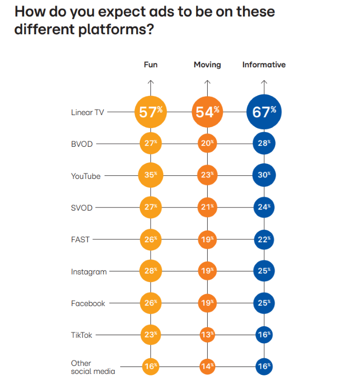Zatímco u reklamy v lineární televizi očekává 67 % dotázaných, že bude především informativní (67 %), u Instagramu a Facebooku je to jen čtvrtina. Stejně tak panují vyšší nároky na televizní reklamu, i co se zábavnosti (57 %) a emocionálnosti (54 %) týče.