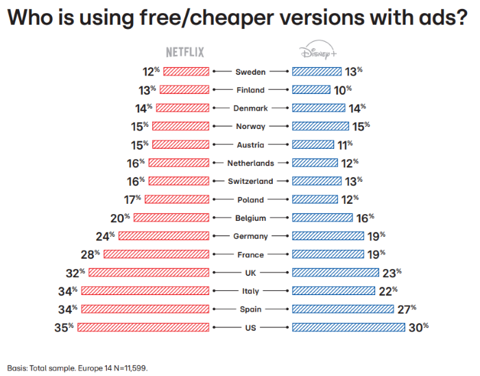 Konkrétně u SVOD služeb je vidět, že Evropané častěji volí modely podporované reklamou nebo levnější služby. K méně nákladným možnostem přechází 29 % respondentů. Netflix si bez reklam předplácí 41 % dotázaných, s reklamou 22 %, v případě Disney+ je to 22 %, respektive 17 %.