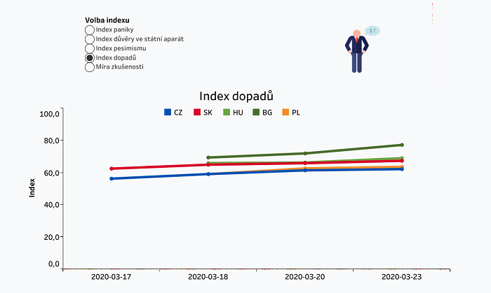 Index paniky sice s postupující pandemií roste i mezi obyvateli České republiky, zachovávají si však v porovnání se sousedy (Slovensko, Polsko) a s dalšími státy střední a východní Evropy (Maďarsko, Bulharsko) relativní klid. Panikaří méně mimo jiné i proto, že v porovnání s těmito zeměmi více důvěřují státu.