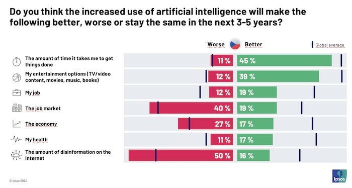 Na druhou stranu se Češi obávají nárůstu dezinformací na internetu, obavy vyjádřila polovina populace. Ve světě panuje v tomto ohledu větší optimismus, obavy sdílí 37 % lidí. Obavy panují také z negativního dopadu AI na pracovní trh, 40 % Čechů očekává zhoršení vlivem rostoucího využití AI.