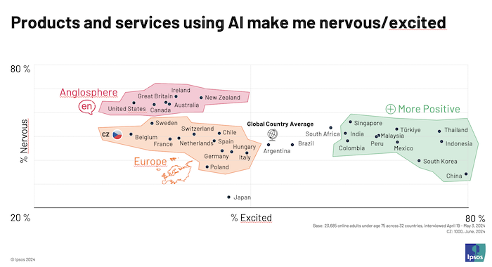 Obecně AI využívá častěji mladší generace a lidé s vyšším vzděláním. Z globálního porovnání vyplývá, že nadšené do AI jsou především asijské země (jako Čína, Thajsko či Indonésie), naopak největší nedůvěra a nervozita panuje v anglosaských zemích a Evropě obecně.