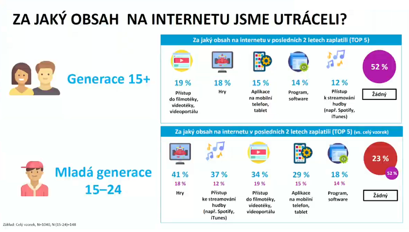Deklarace respondentů do výzkumu, za co jsou ochotní na internetu platit, se však může rozcházet s realitou. Přestože do výzkumu nejčastěji lidé uvedli, že by hypoteticky na internetu platili za zpravodajství, reálně se nejvíce platí za přístupy k videoobsahu, dále za hry a za aplikace na mobily. Přestože se celkově placení na internetu v české populaci zvýšilo za všechny služby o osm procent, stále zůstává asi polovina těch, kteří si žádnou službu nekoupili. Opět je patrná větší ochota mladších za jakékoliv placené služby na internetu platit.
