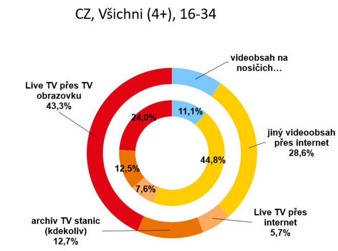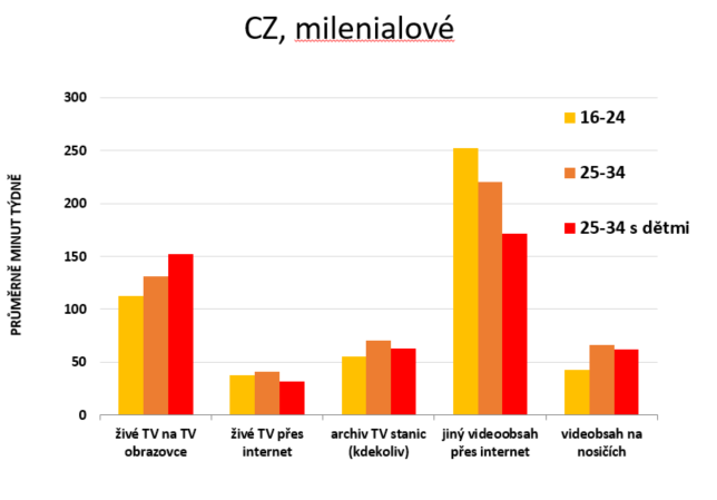 U mladých českých diváků ve věku 16-34 let se sledovanost videoobsahu odlišuje, nejvyšší podíl sledovaných videí tvoří internetová videa (45 %). Pokud ale mladí lidé začnou zakládat rodiny, jejich vzorec chování se mění a stejně tak se mění s tím, jak stárnou. V případě lidí ve věku 25-34 let s dětmi jsou už opět patrné preference směrem k sledování živého TV vysílání a úměrně tomu klesá sledovanost jiného videoobsahu přes internet.