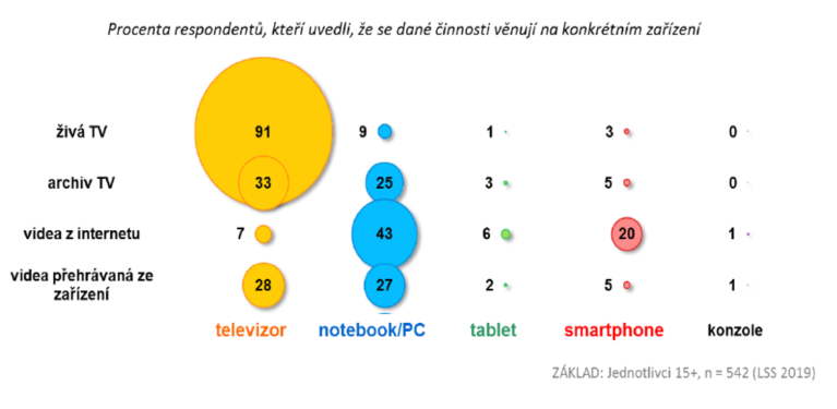Britská data také ukazují, že zatímco živé televizní sledování lidé nejvíce sledují na televizoru, služby jako Netflix tak konzumuje jen 74,2 % lidí. Zbytek k tomu volí notebook (12,1 %), tablet (7,1 %) nebo chytrý telefon (6,5 %), na kterém nejvíce sledují i videa na YouTube (35,5 %) a další online videa (46,7 %). V Česku mnohem více konzumují lidé internetová videa na notebooku než na mobilu. Živá televizní sledovanost je dominantně sledovaná přes televizní obrazovku.