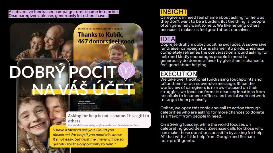 - Za návrh printové reklamy pro organizaci Domov sv. Anežky byli zlatem oceněni Martin Božík a Yousef Yaghmour z Leo Burnett.