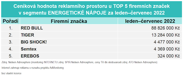 V kategorii energetických nápojů investovala za období leden až červenec letošního roku do reklamy nejvíce značka Red Bull. Podle monitoringu reklamy Ad Intel za inzerci, jejíž hodnota odpovídá ceníkovým cenám, zaplatila téměř 89 milionů korun. S velkým odstupem za ní byla značka Tiger s 13 mil. korun a Big Shock! s necelými 4,5 miliony korun. V první pětici se umístily také značky Semtex a Erebos.