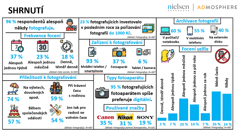 Téměř celá česká populace (96 %) alespoň někdy fotografuje, minimálně jednou měsíčně pak fotografuje 77 % respondentů. Denně nebo téměř denně fotografuje necelá pětina. Drtivá většina (93 %) používá k fotografování mobilní telefon nebo smartphone. Fotoaparát zmínilo 37 % dotázaných. Vyplývá to z průzkumu Nielsen Admosphere, který pro MediaGuru.cz připravila.