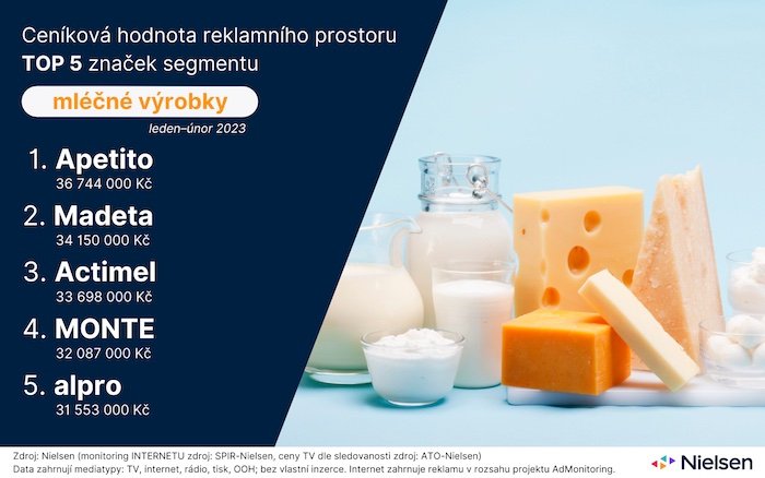 V segmentu mléčných výrobků investuje letos do reklamy nejvíce prozatím značka Apetito od společnosti Savencia F&D. V lednu a únoru vložila do reklamy 36,7 milionů korun. Na druhém místě je Madeta s 34,2 mil. korun a Actimel od Danone s 33,7 mil. korun. Vyplývá to z monitoringu reklamy Ad Intel, jež sleduje ceníkové ceny inzerce.