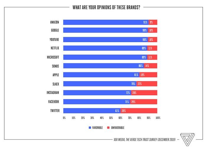 Nejpříznivěji ze všech je hodnocen Amazon (91 %), Google (90 %) a YouTube (90 %). Nejméně příznivě to opět vyšlo pro Twitter, kde ho pozitivně vnímá jen 61 %.