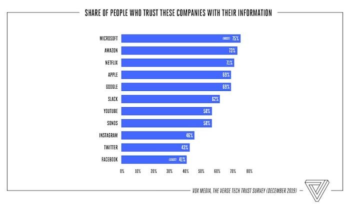 Největší důvěře se však těší Microsoft (71 %), nejmenší Facebook (41 %), u kterého je až 72 % dotázaných přesvědčeno, že drží v rukách až příliš moci.