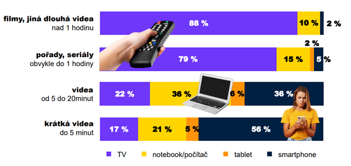 Zároveň platí, že pro videoobsah, především delší stopáže, volíme větší obrazovky. Pro filmy či videa přes jednu hodinu tvoří podíl TV obrazovky až 88 %. V případě sledování pořadů a seriálů v délce kolem jedné hodiny představuje podíl TV obrazovek 79 %. Naopak u kratších videí od 5 do 20 minut a ještě výrazněji u krátkých videí do 5 minut jsou nejsilnější chytré telefony. Ve druhém případě je jejich podíl 56 %. „ Za uplynulých pět let se podíl sledovanosti kratších videí přesouvá z počítačů na mobilní telefony,“ popsala Tereza Šimečková.
