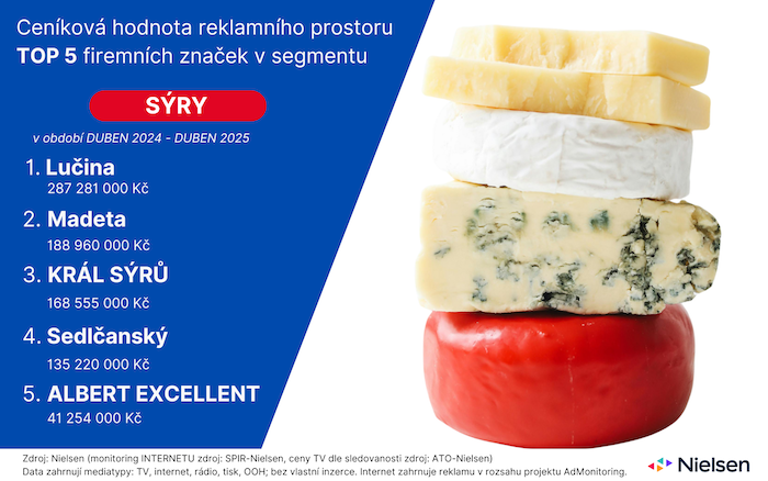 Největším reklamním zadavatelem v kategorii sýrů byla v období od dubna loňského roku do dubna letošního roku značka Lučina, jež investovala do reklamy v ceníkových cenách přes 287 milionů korun. Na druhém místě se umístila Madeta s téměř 189 miliony korun a třetí příčku obsadil se 169 miliony korun Král sýrů. Vyplývá to z monitoringu reklamyAd Intel výzkumné agentury Nielsen.
