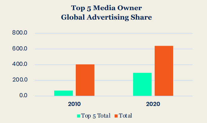 Čtyři nejsilnější za rok 2020 – Google, Facebook, Alibaba a Bytedance (vlastník sociální sítě TikTok) – dohromady získaly z reklamy podle studie 296 mld. USD, což představuje téměř polovinu (46 %) celkových reklamních příjmů médií. Před deseti lety, v roce 2010, tvořily nejsilnější pětici Google, Viacom společně s CBS, News Corp. dohromady s Fox, Comcast a Disney. Jejich celkový souhrnný příjem byl 70 mld. USD, což představovalo 17 % celkových reklamních příjmů mediálních vlastníků v celém světě.