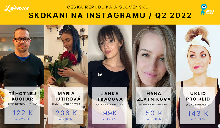 Největším skokanem druhého kvartálu se stal Těhotnej kuchař, kterému se za poslední tři měsíce zvýšilo instagramové publikum o více než 900 % a ke konci června dosáhl na 122 tisíc sledujících. Dalším skokanem je například slovenská fotbalistka Mária Hutirová nebo specialistka na zdravou výživu Janka Tkáčová.